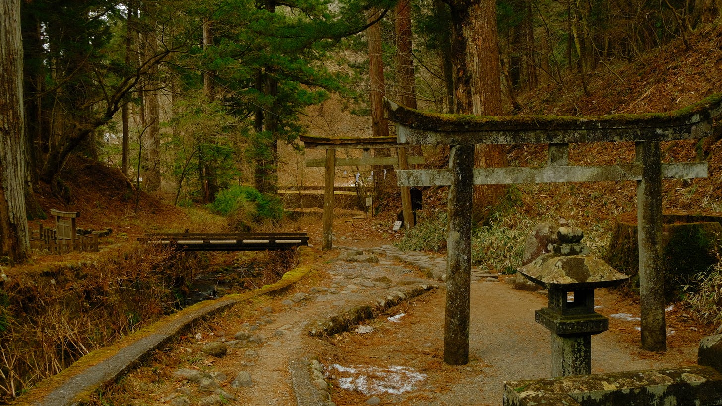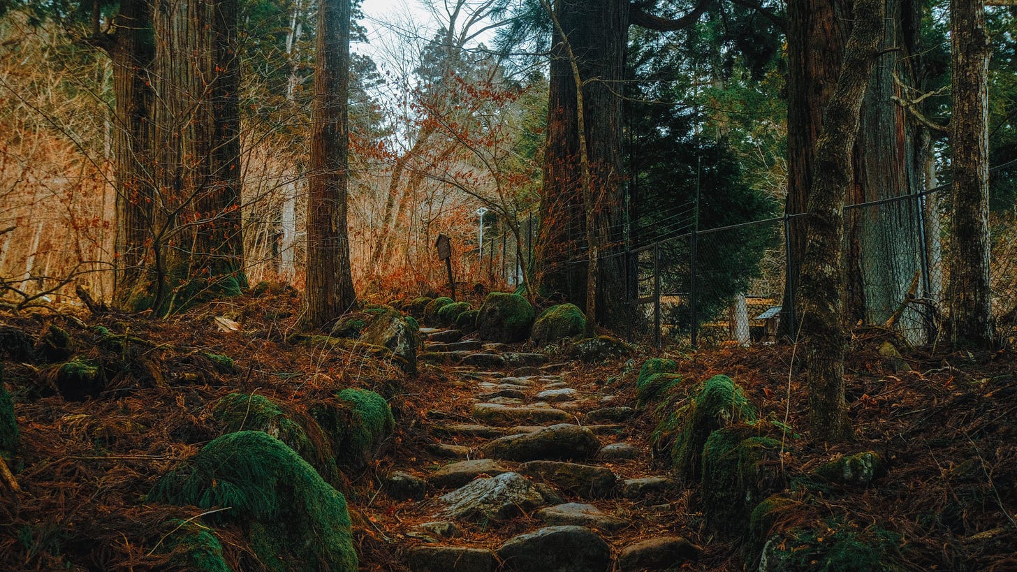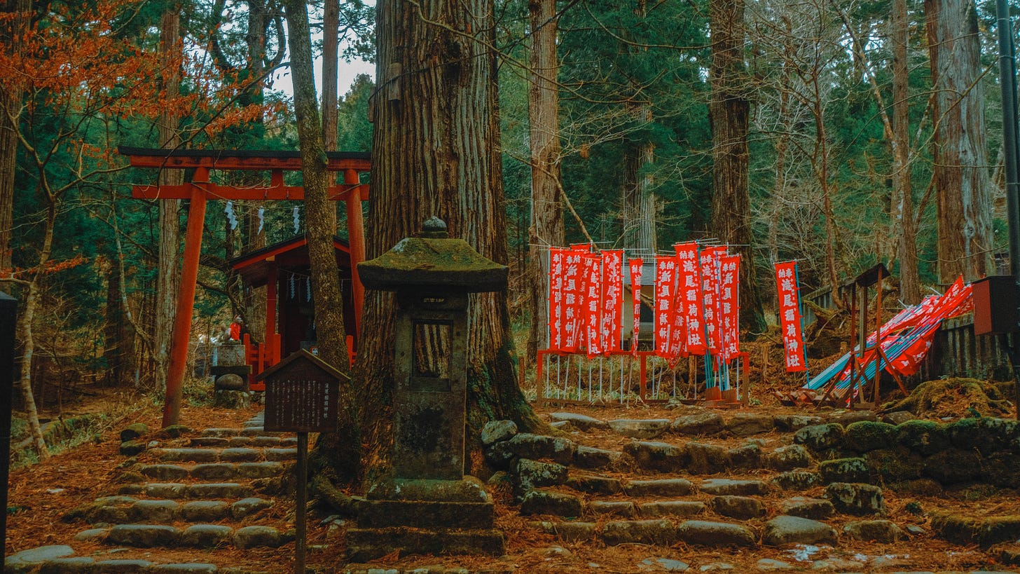 Small shrines emerged between ancient cedar trunks, half-hidden, moss-drunk, as though time had folded gently around them. Moss-covered stones older than the ice age. stones that have outlived entire climates, lay embedded beside the path.