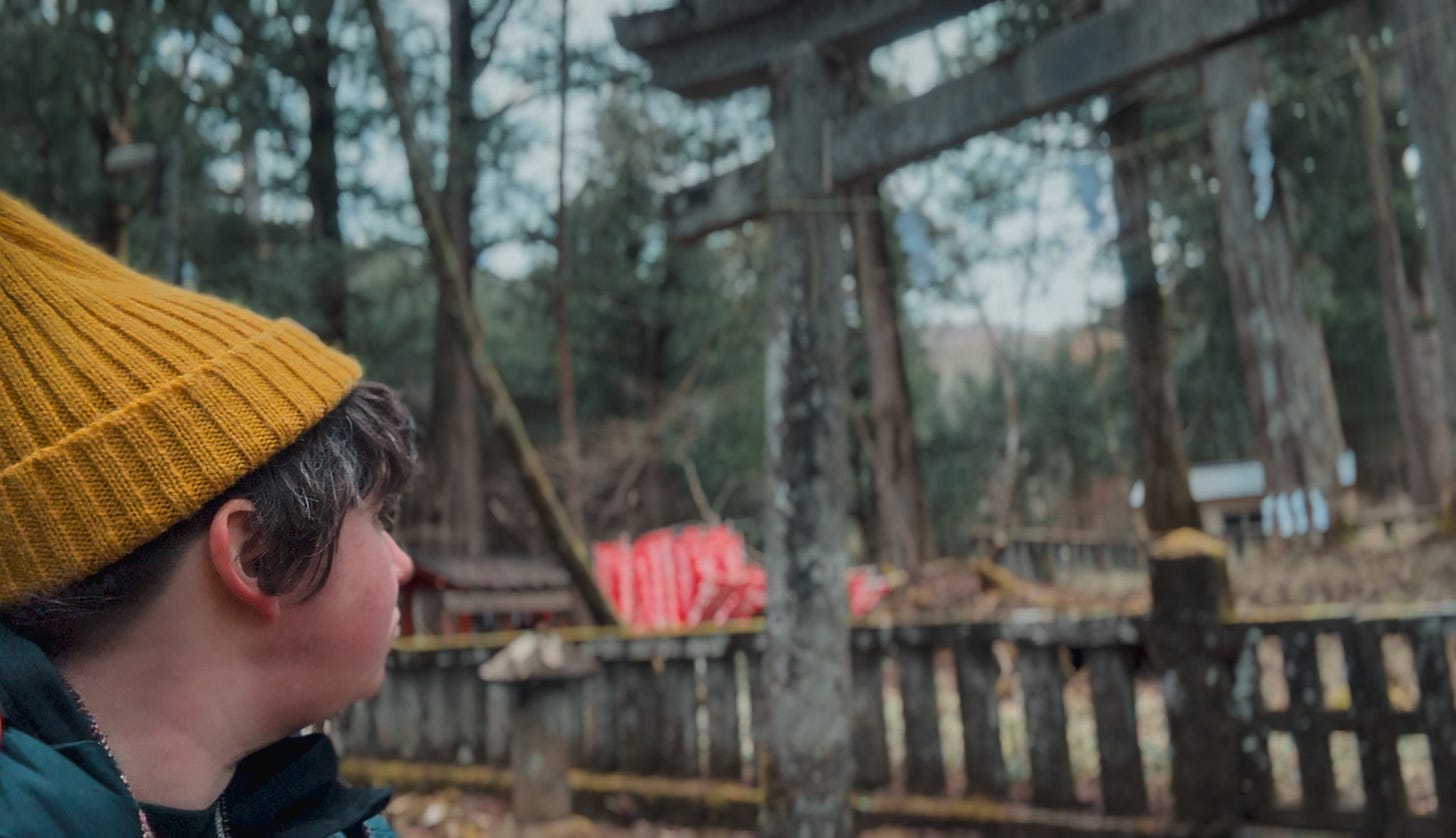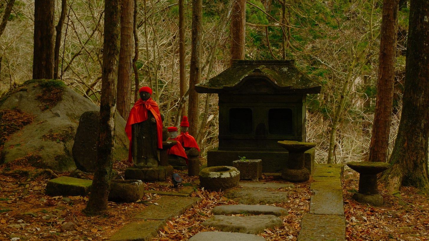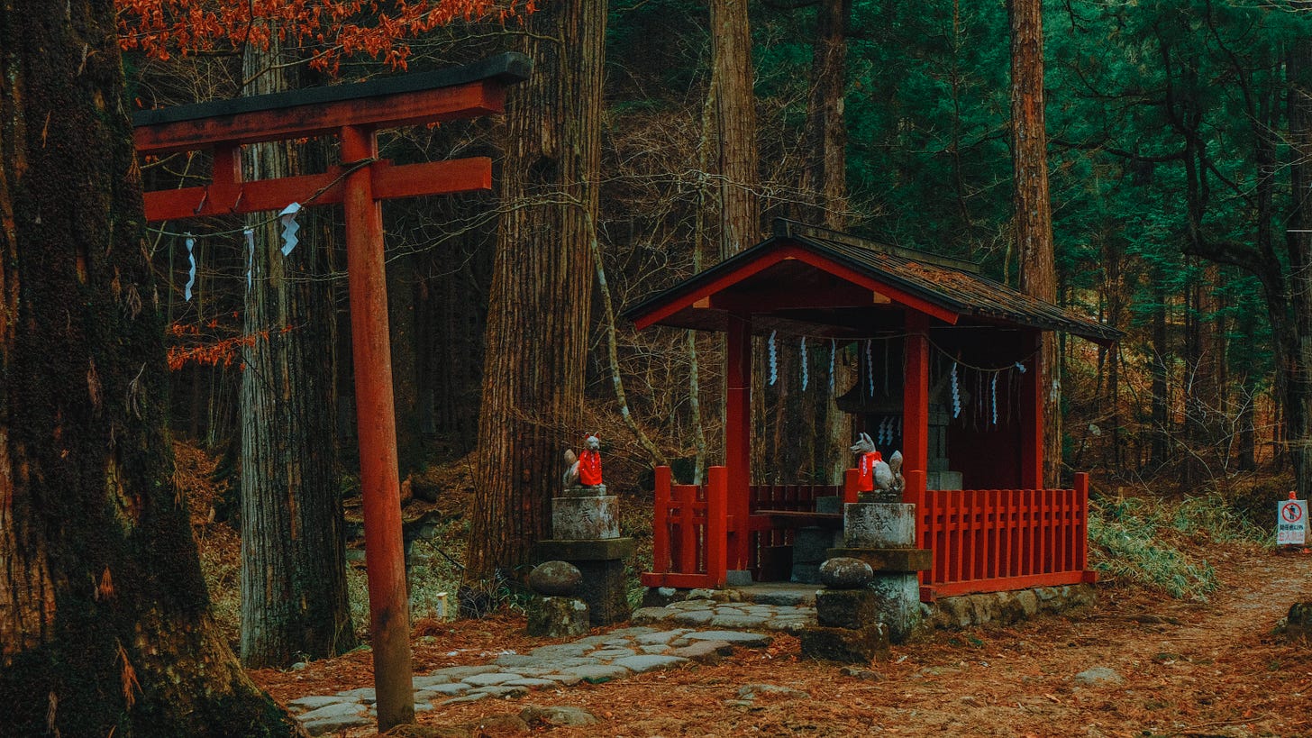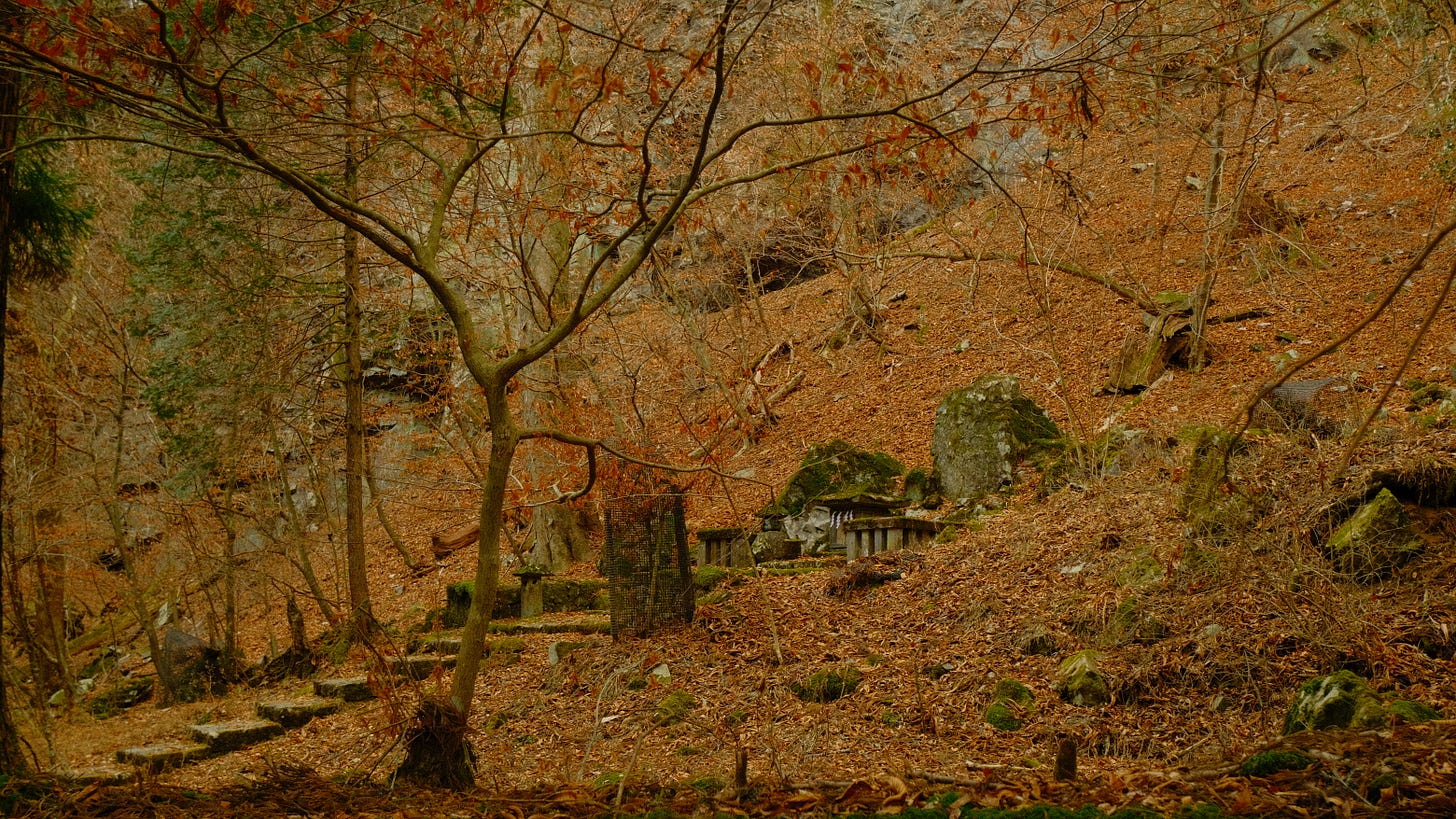 Small shrines emerged between ancient cedar trunks, half-hidden, moss-drunk, as though time had folded gently around them. Moss-covered stones older than the ice age. stones that have outlived entire climates, lay embedded beside the path.